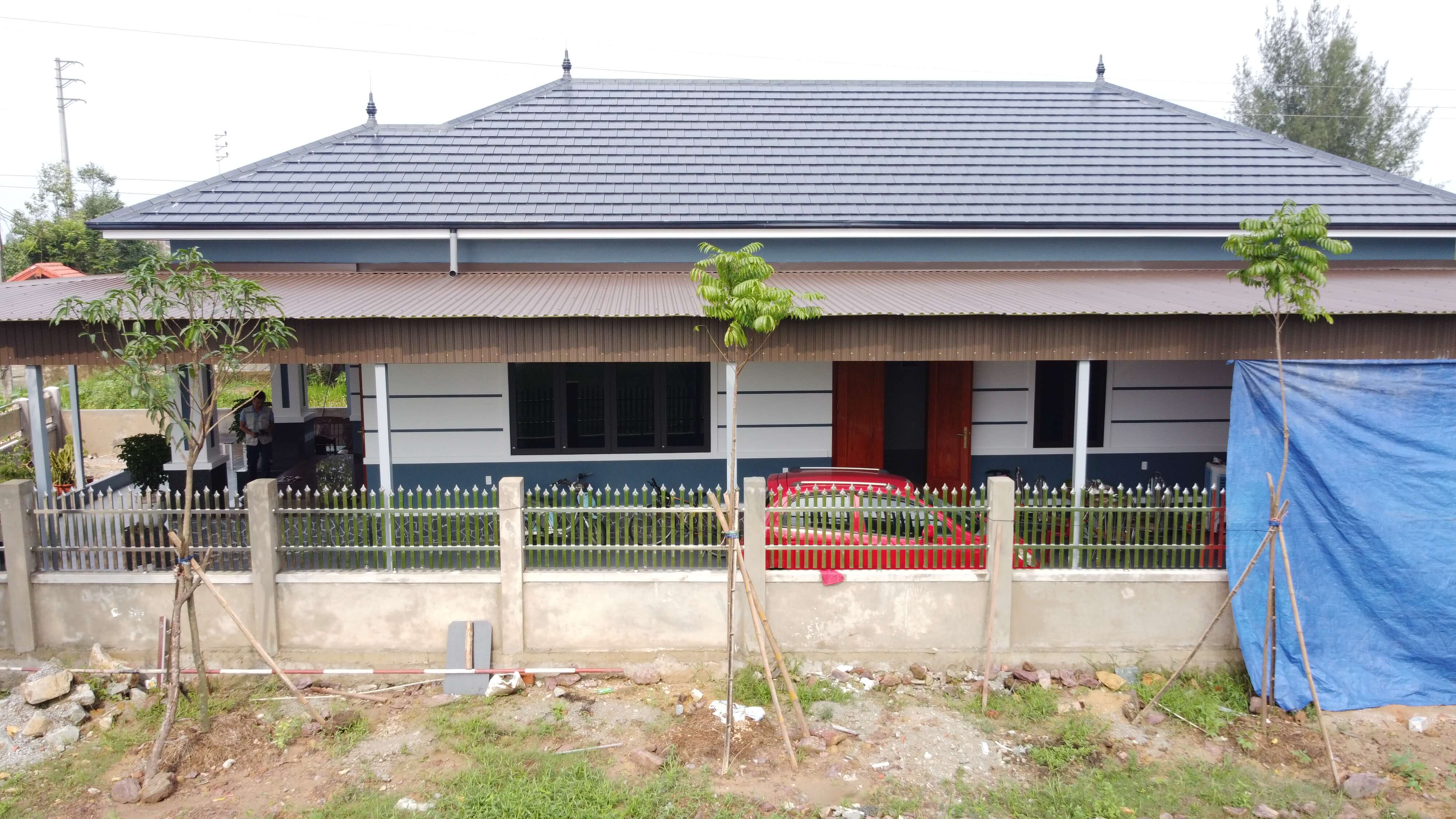 Về công trình chính, ngôi nhà cấp 4 mái nhật được phủ gam màu chính là màu trắng, kết hợp với gam màu xanh rất là thời thượng. Không cần các chi tiết trang trí cầu kỳ, phức tạp mà vẫn làm toát lên được sự sang trọng, quý phái trong từng đường nét.