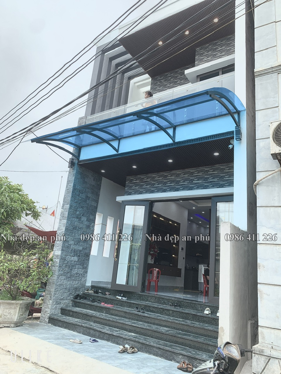 Điểm nhấn của nhà phố 2 tầng này là các mảng tường được ốp đá và ốp gạch thẻ, phần lam bê tông được sơn màu ghi, trần sảnh tầng 1 và tầng 2 được ốp nhựa giả gỗ rất sang trọng. Đặc biệt phần để che mưa che nắng cho phần sân chủ nhà đã cho lợp mái kính màu xanh vừa đẹp vừa tinh tế.