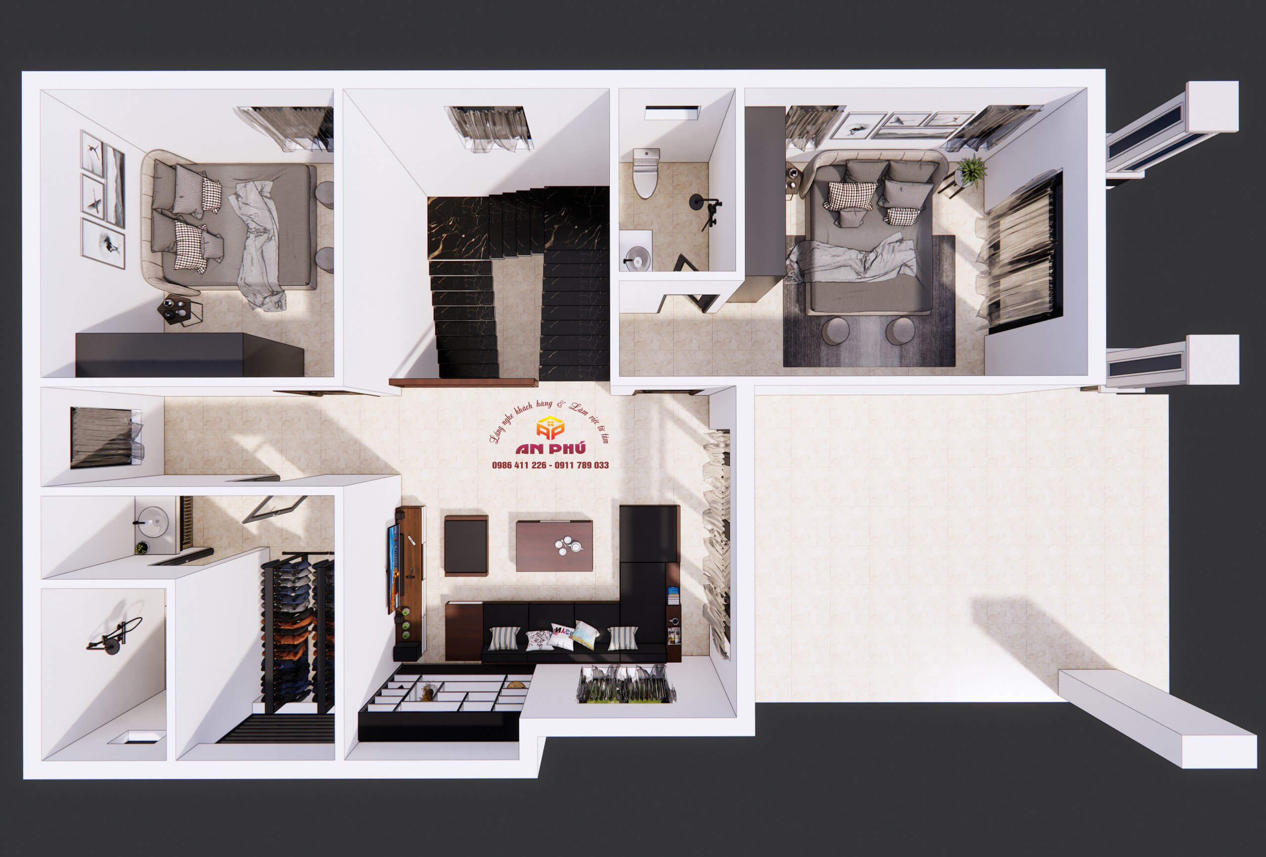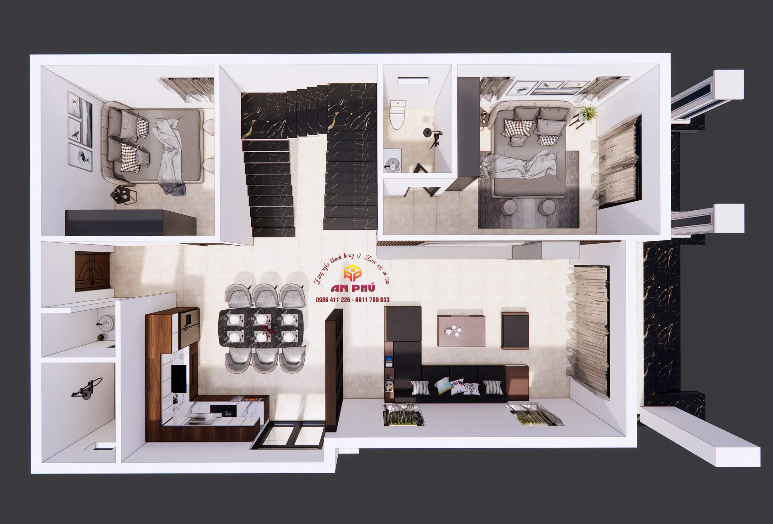 Tầng 1 : khách bếp + 2 phòng ngủ + 2 nhà vệ sinh ( 1 chung và 1 riêng)